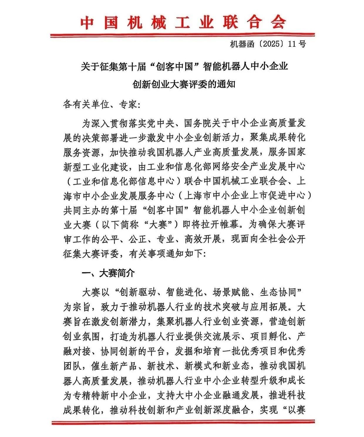 5. 关于征集第十届“创客中国”智能机器人中小企业创新创业大赛评委的通知
